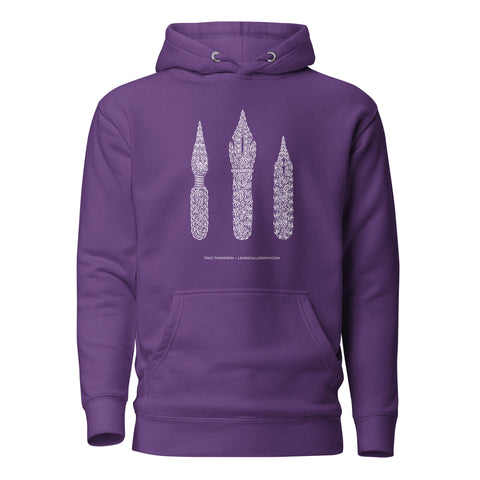 Are you ready for sweatshirt weather? Layer up and strut your calligraphy style. With a front pocket and snug hood, it doesn’t get much better than this. Art by Traci Thompson.