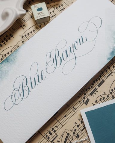 Blue Bayou, The Creative Kinds crema opaque teal blue small batch pan watercolor handmade in Italy, is perfect for calligraphy and watercolor painting. (This color is part of the Dear Nostalgia set.)