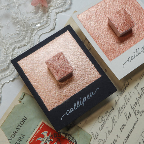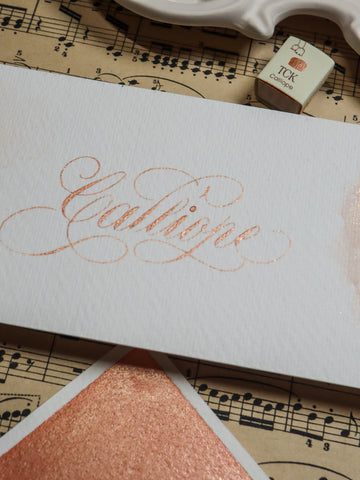 Calliope, The Creative Kinds shimmery peach, small batch pan watercolor handmade in Italy, is perfect for calligraphy and watercolor painting. (This color is also part of the Dear Nostalgia Set.)