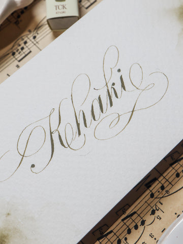 Khaki, The Creative Kinds crema opaque gray green small batch pan watercolor handmade in Italy, is perfect for calligraphy and watercolor painting. (This color is part of the Dear Nostalgia set.)