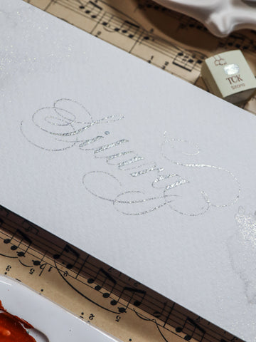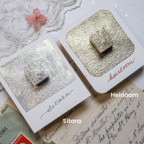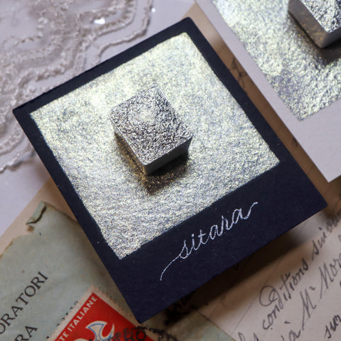 Sitara, The Creative Kinds shimmery silver-gold, small batch pan watercolor handmade in Italy, is perfect for calligraphy and watercolor painting. (This color is also part of the Dear Nostalgia Set.)