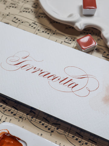 Terracotta, The Creative Kinds crema opaque red orange small batch pan watercolor handmade in Italy, is perfect for calligraphy and watercolor painting. (This color is part of the Dear Nostalgia set.)